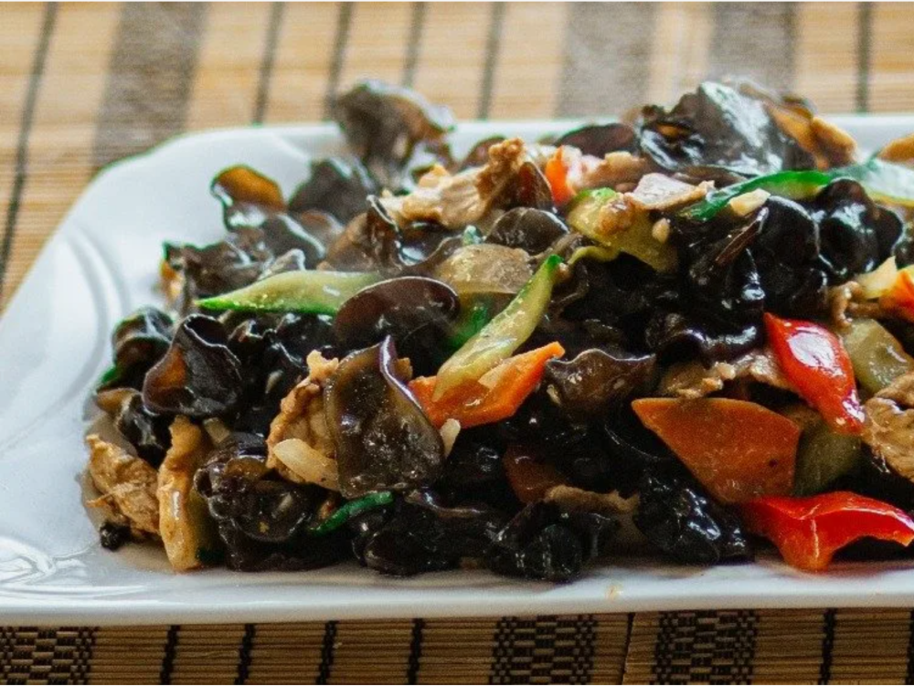 Свинина, жаренная с черными древесными грибами и яйцом “МуШу”