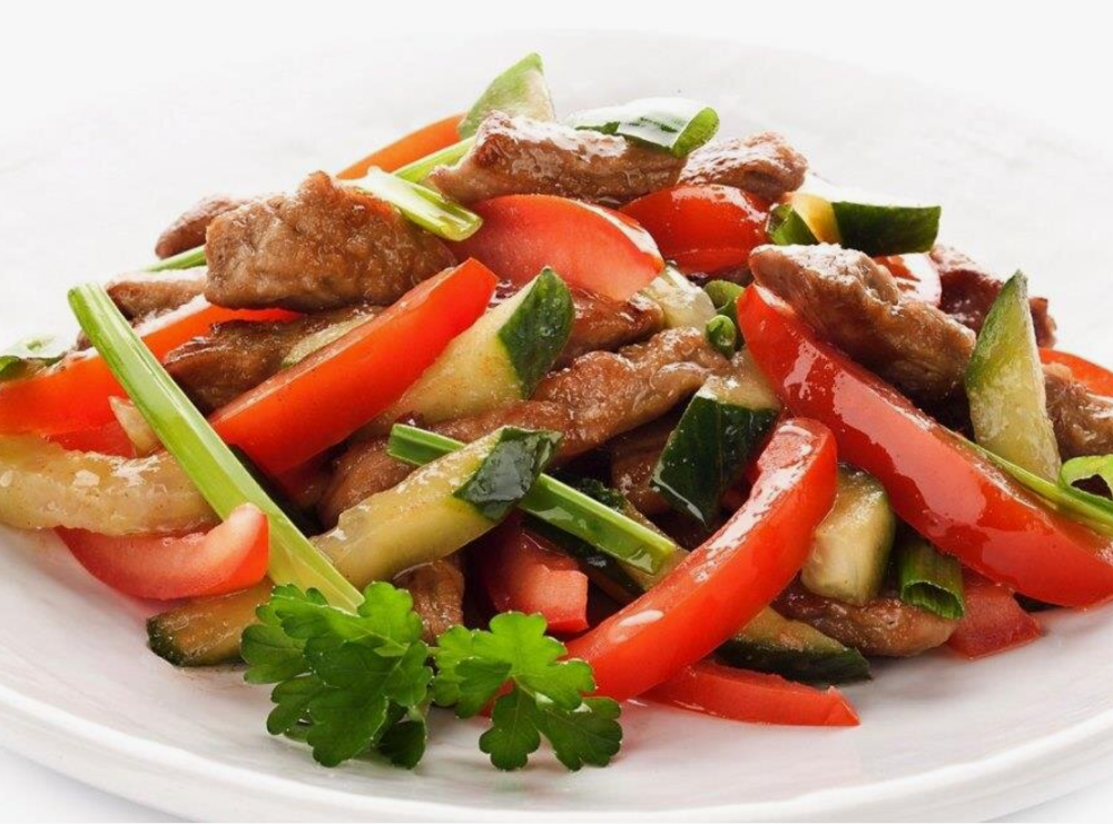 Тушеная говядина, перец сладкий, кинза, огурцы